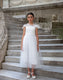 Lace  Bodice with 3D Flowers, scallop edge sleeve attached to gorgeous  full tulle skirt. Skirt is High low.