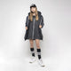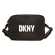 Shiny shopping bag. Large pocket on the top. Bi-color fancy handle. Flap closing by two magnetic snaps. Rubber effect DKNY label at the front. Ilustration rubber print on the top in contrasted color. Dimensions: 25cm x 34cm x 4.5cm.