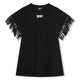 Elastane cotton sleeveless dress with shinny polyamide twill yoke at the bottom, elasticated waist, zipped and branded fastener on the front, DKNY rubber print on the front.
