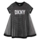 Long sleeves dress in milano fabric for the top, fancy laser cut jersey with jersey lining for the bottom. Bright branded illustration at front. Rubber effect DKNY label at the back neckline.