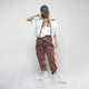 Dyed pants in cotton twill, patch pockets on the sides. Sold with a belt with a plastic clip fastener. Adjustable waist until 10 years. Zipped and buttoned fastener on the front. Rubber effect DKNY logo label on back flap pocket.